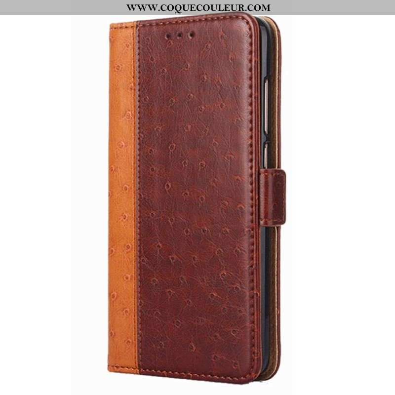 La housse en simili cuir à texture autruche protège l'ensemble du Xiaomi Redmi Note 11 Pro / Note 11 Pro 5G tout en servant de portefeuille et de support.