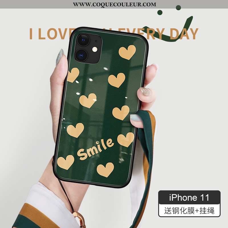 Coque iPhone 11 Verre Cœur Vert, Housse iPhone 11 Mode Violet